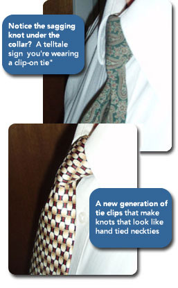 Why settle for neckties that sag under the collar and look like clip-on ties? We have a new generation of tie clips that make knots that look like hand tied neckties so you'll have no more sagging knots, no more flat neckties, and no more jokes!